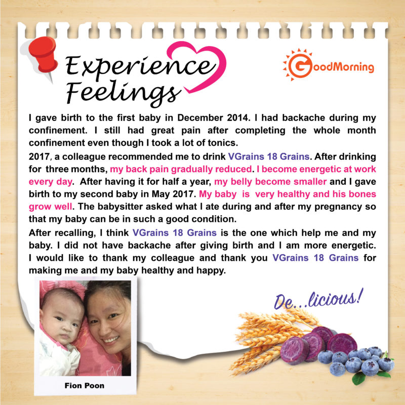 After drinking VGrains 18 Grains for three months, my back pain gradually reduced, I become energetic at work everyday, my belly become smaller. I gave birth to my second baby in May, my baby is very healthy and his bones grow well. GoodMorning VGrains is the one which help me and my baby.