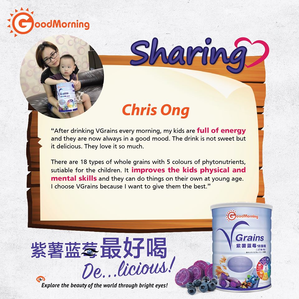 There are 18 types of whole grains with 5 colours of phytonutrients ,suitable for the children . It improves the kids physical and mental skills and they can do things on their own own at young age . I choose VGrains because I want to give them the best.