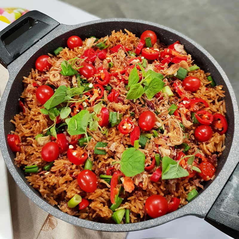 - Add water, evaporated milk, tomato puree, VHalia, pandan leaf (crushed), and salt