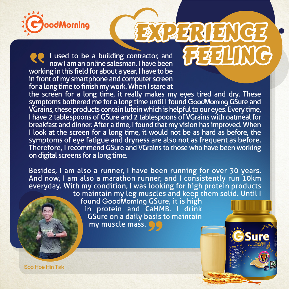 Besides, I am also a runner, I have been running for over 30 years. And now, I am also a marathon runner, and I consistently run 10km everyday. With my condition, I was looking for high protein products to maintain my leg muslces and keep them solid. Until I found GoodMorning GSure, it is high in protein and CaHMB. I drink GSure on a daily basis to maintain my muscle mass.